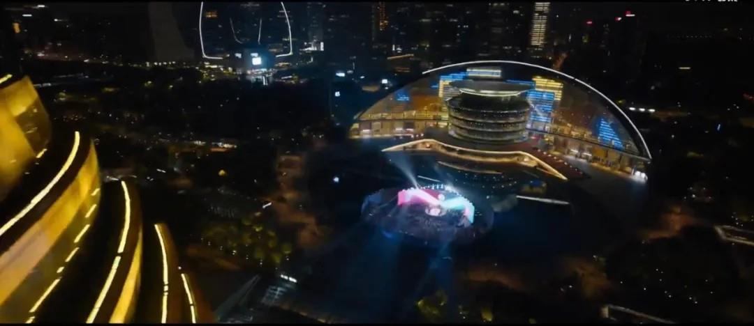 画面背景中,金色的杭州国际会议中心(“大金球”)一闪而过,与月牙形的大剧院共同构成“日月同辉”的经典景观。