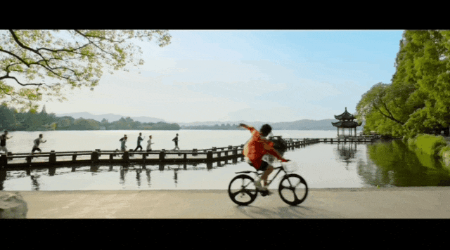 影片中也穿插了许多生活化的场景。电影主角陈烁与街舞队员们户外训练跑步的镜头,就取景于西湖长桥。
