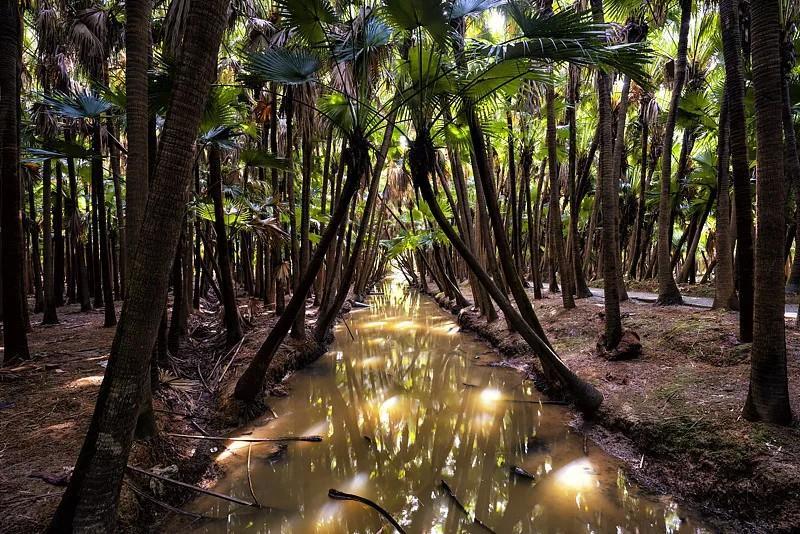 放眼望去,成片的蒲葵树高大挺拔,葵叶宽阔舒展,形成独具岭南气韵的森林景观。当微风吹过,无数葵叶沙沙作响,波光与树影交织出一幅自然的交响画卷。