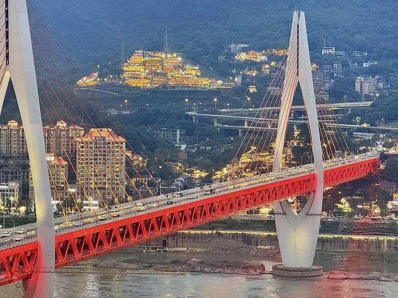 当夜幕降临,梭形桥墩与空中索道一同点亮城市夜空,构成山城特有的“空中走廊”景观。