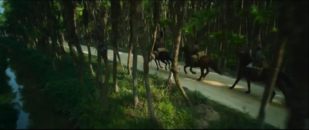 在电影中,运“荔”队伍点燃火把,昼夜奔跑在一片郁郁葱葱的树林间,火光与翠绿交织,画面格外震撼。这一幕取景于广东江门新会南坦岛的葵林生态湿地公园。