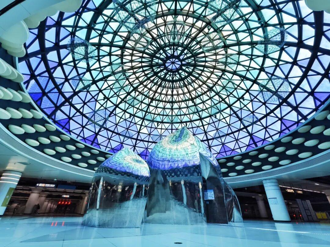 3、7号线交汇的武汉商务区站,出入口开通数量已超10个。站内“梦幻星空”主题设计使其获封“亚洲最美地铁站”。