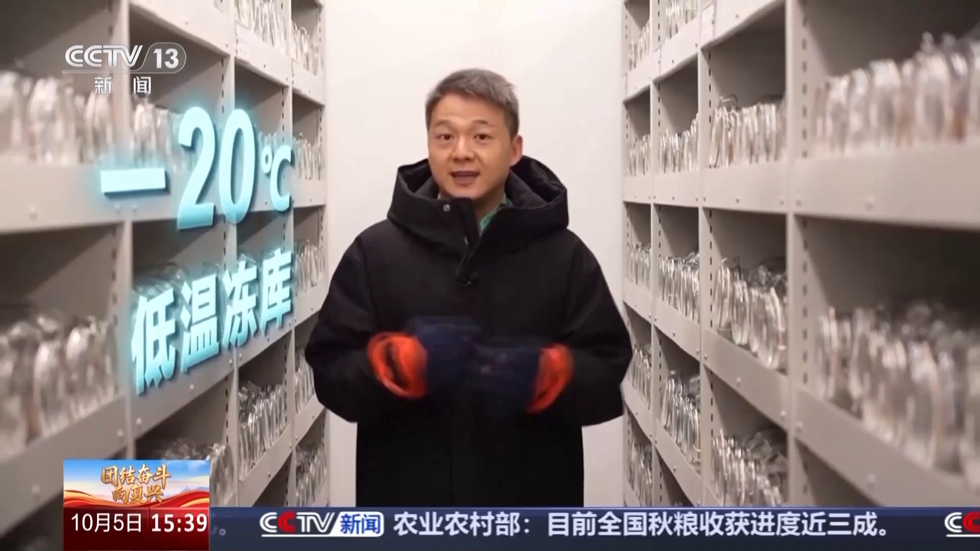 总台央视记者 帅俊全:穿着厚厚的羽绒服,现在我们就进入了零下20℃的低温冻库,这里也是亚洲最大的野生生物种质资源的一个保存库。别看这个屋子只有40平方米左右,但是它非常重要,因为在其他4个活动库保存的珍贵的种子在这个屋子里面都有所备份,所以它就好像是一个长期保存的“诺亚方舟”。这里面保存有很多珍贵的种子,比如说这一瓶里面保存的是我们科研人员从珠峰海拔6200多米的高处采集回来的须弥扇叶芥的种子就在这里面,然后还有从蒙自天坑采集回来的大花石蝴蝶的珍贵的种子,在这里都有备份。那么迄今为止,我们科研人员是一共采集保存了大概1.2万种10万份,也就是占到了我们国家1/3左右的这样一个野生植物的种质资源。