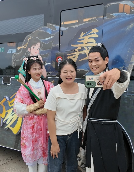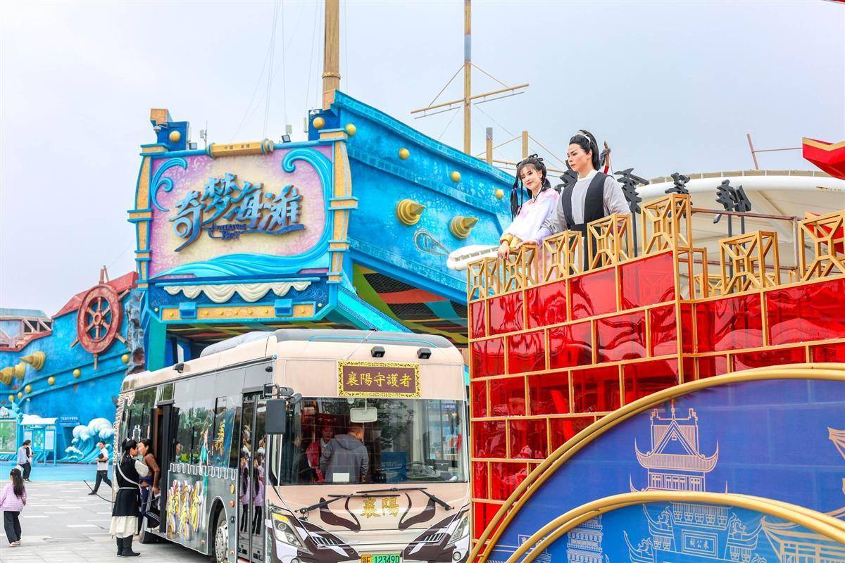 花车之上,古装“郭靖黄蓉”凭栏远眺;公交车旁,另一对“郭靖黄蓉”复刻经典动作,两组角色遥相呼应……当天上午,“侠义车队”驶入华侨城、唐城、古隆中等景区,瞬间点燃市民游客热情。现场同步进行的古风表演、互动游戏与穿梭往来的NPC,共同营造出沉浸式江湖体验。