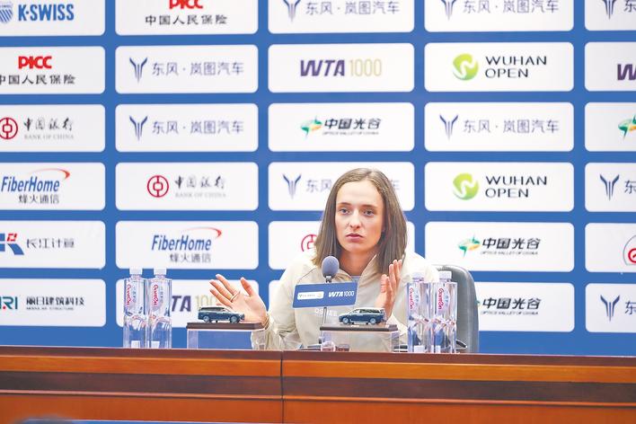10月5日,斯瓦泰克在武网媒体见面会上发言。 (武网组委会供图)