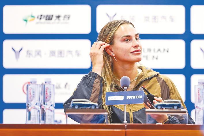 10月5日,武网媒体见面会上,萨巴伦卡对连续第四次夺冠显得信心十足。(武网组委会供图)