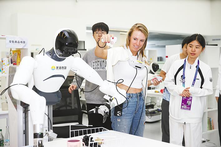 武网球星与人形机器人互动。 (武网组委会供图)