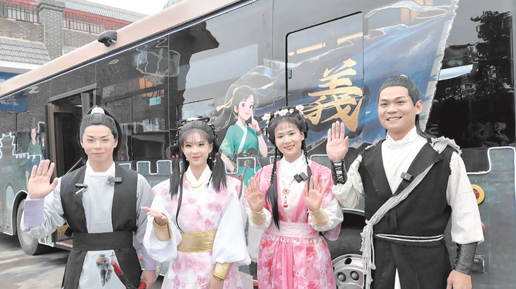 驾驶室里“俏黄蓉”稳稳地开着车,这位 “俏黄蓉”的扮演者姚玲玲,是一位有着5年工龄的线路长,灵动眼眸间尽是黄蓉的机敏,与驾驶座旁身着青衫的 “郭靖” 扮演者王宗柳形成鲜明呼应 ,这位土生土长的襄阳汉子正气凛然,被大家称赞 “形神兼备”。