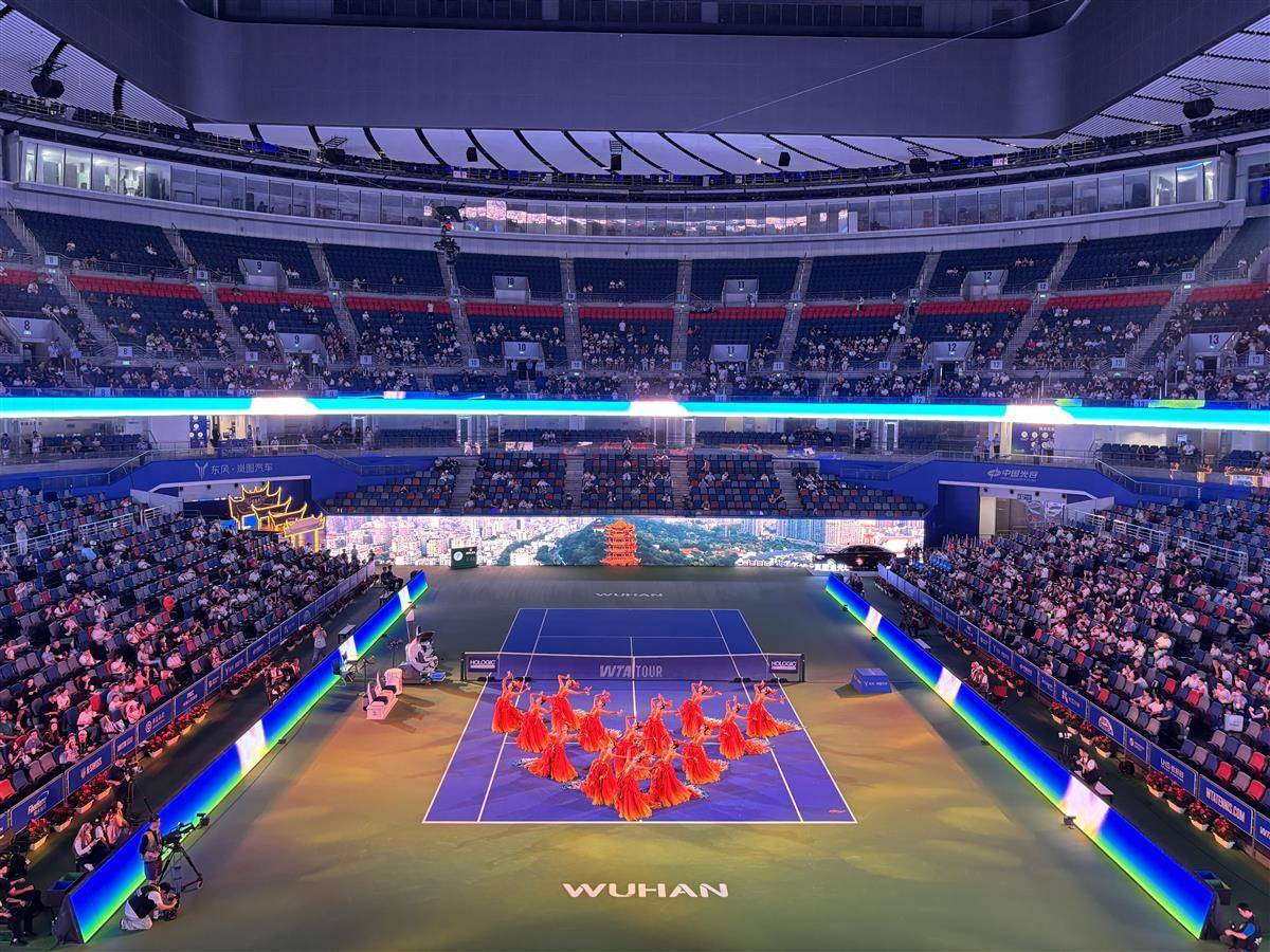 开幕式在震撼的开场灯光秀中开启,光影流转间勾勒出武汉“白云黄鹤”的城市意象与网球运动的动感活力。随后,舞蹈《凤舞楚天》登场,以灵动舞姿展现荆楚文化魅力。正值中秋佳节,《但愿人长久》《汉阳门花园》《月亮代表我的心》《如愿》等歌曲联唱温情上演,传统韵味与城市记忆交融,引发全场共鸣。