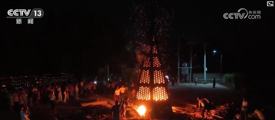 中秋烧塔是闽粤赣地区传承千年的中秋祈福仪式。在江西吉安钓源古村,一座青砖瓦片搭建的圆形塔台矗立在农耕广场中央,游客们将柴、瓦、竹、盐、酒五种“五福物料”投入塔中,寄托着美好祝愿。