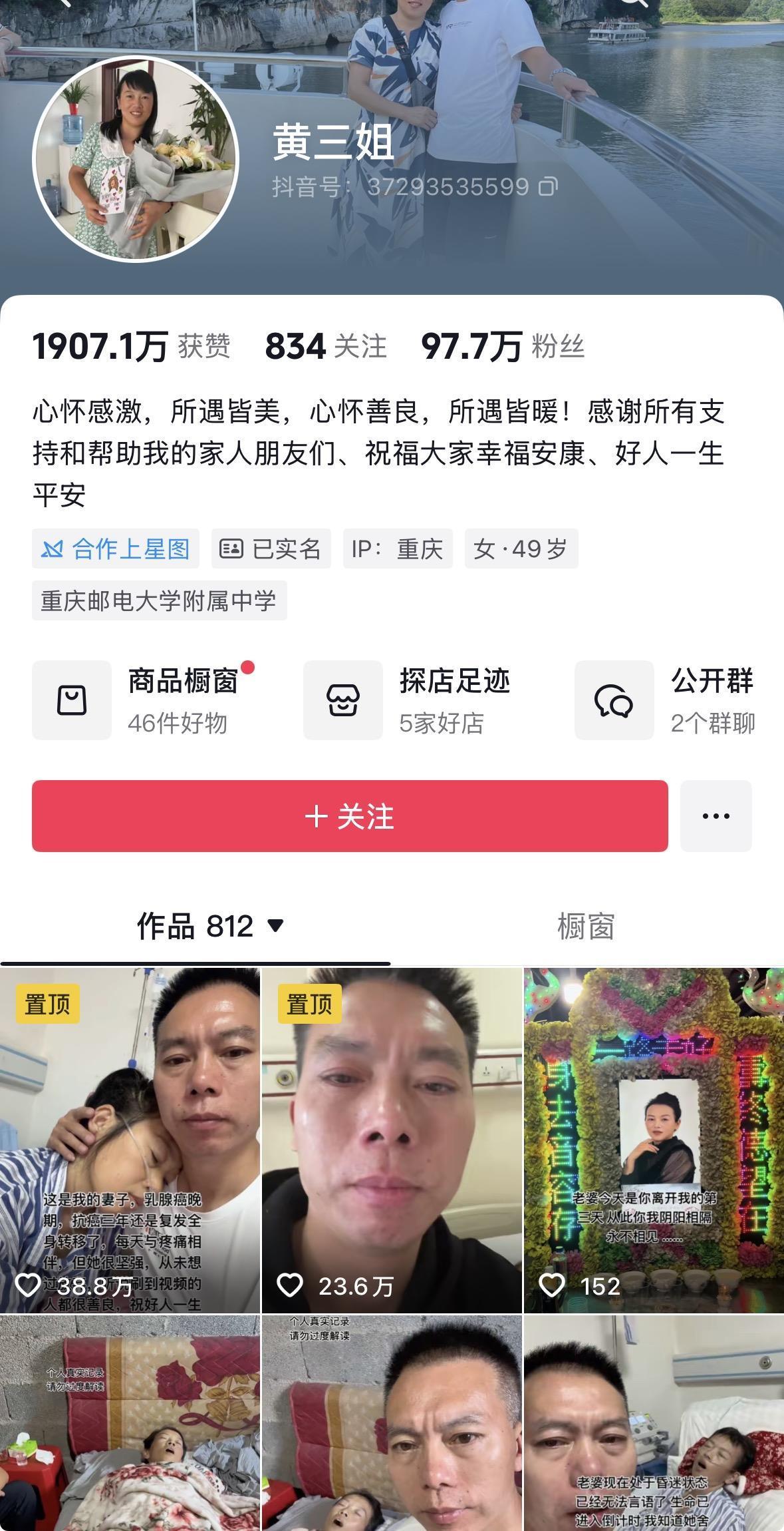 黄三姐的主页显示,她是重庆秀山人,今年49岁。视频显示,2022年8月,黄三姐确诊患有乳腺癌,当年10月,她与丈夫开始拍摄短视频分享自己四处求医的抗癌之路。三年多以来,黄三姐发布了800多个视频,粉丝积累了近百万。她在多个视频中感谢丈夫,称“谢谢老公宁愿负债也没有放弃我。”