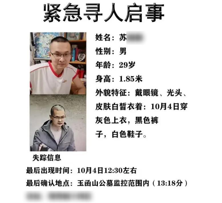 失联男子苏某某的亲属向极目新闻记者介绍,苏某某今年29岁,10月4日从家中出走,来到了自家附近的玉函山上。监控画面显示,4日13时18分左右,苏某某从济南玉函山公墓进入玉函山后失联。当晚,他们便向当地警方报案,但多日搜寻无果。