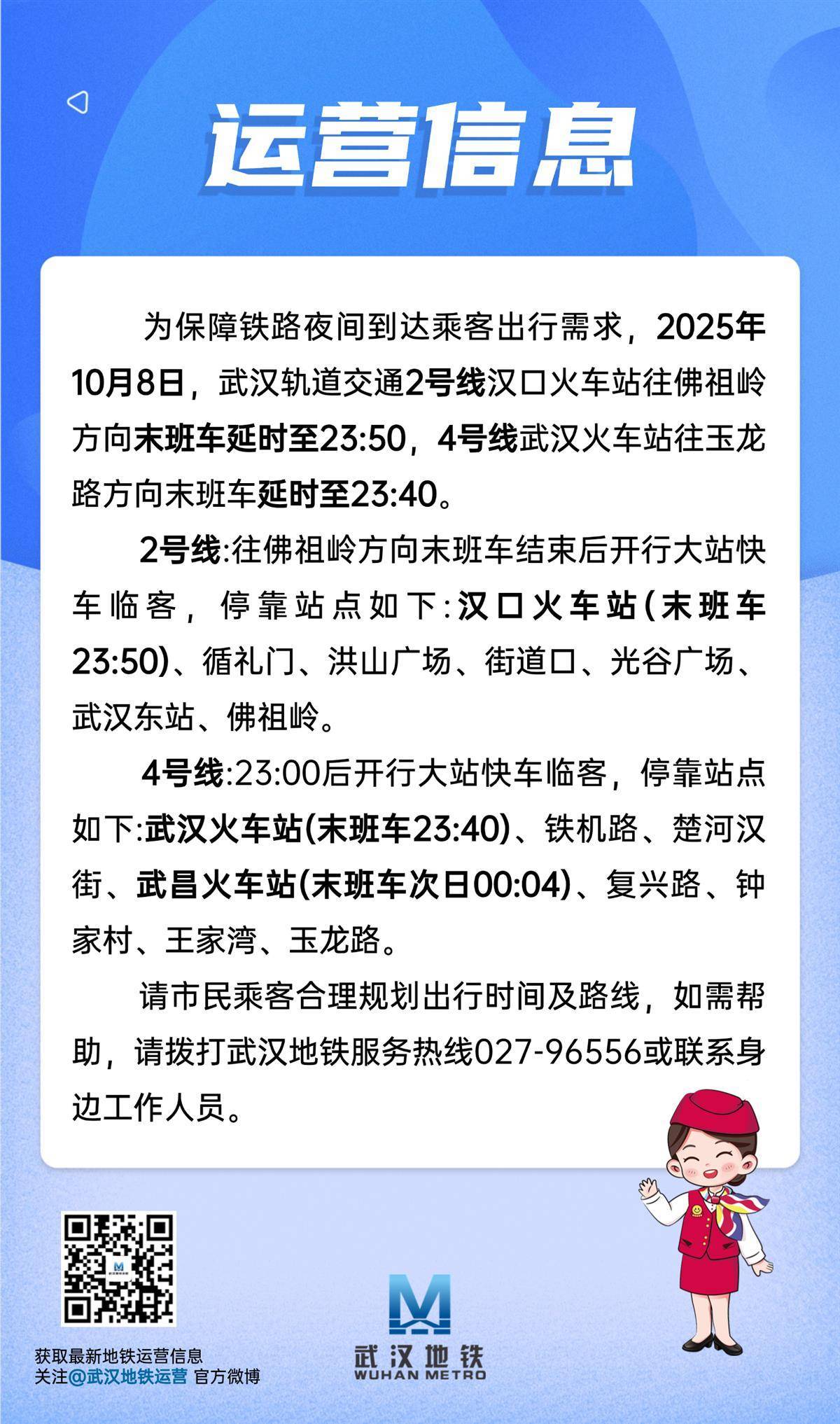 为保障铁路夜间到达乘客出行需求,今日(10月8日),武汉轨道交通2号线汉口火车站往佛祖岭方向末班车延时至23:50,4号线武汉火车站往玉龙路方向末班车延时至23:40。