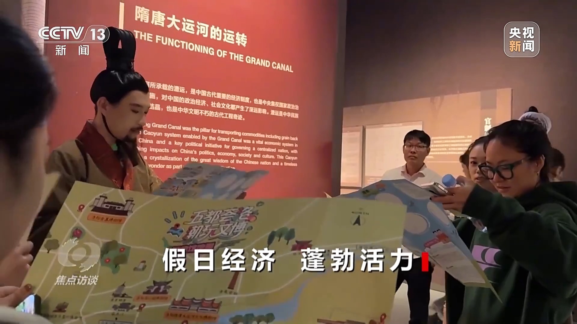 在河南洛阳的隋唐大运河文化博物馆,一位身穿古装的角色扮演者突然走向游客,简单自我介绍后,将特制的文博地图送到大家手中,并邀请众人一起漫步展厅,沉浸式探寻大运河的前世今生。