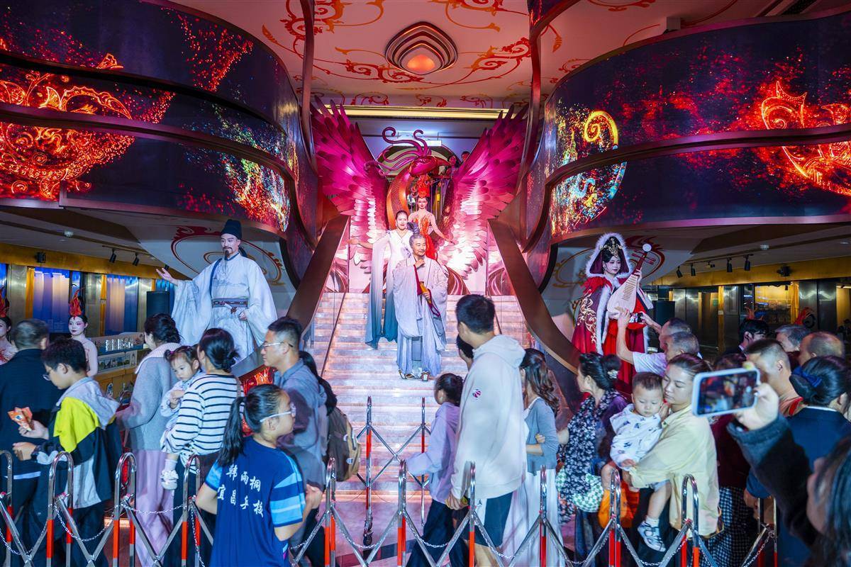 九歌巷子还将楚文化元素融入每个互动环节。“神仙镖局”主题任务吸引年轻人组队抽取盲盒锦囊,“神仙对弈”NPC挑战活动让游客与“山鬼”猜拳、对弈五子棋。街区还推出“楚楚动人”百人汉服寻宝活动,参与者身着汉服全巷寻宝,获得惊喜小礼物。