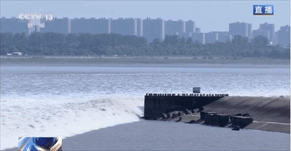 潮水好似一条白色巨龙,横贯江面。仔细看会发现,它就像是一堵银色的城墙,带着雷霆万钧之势奔腾而来。大家可以看到老盐仓壮观的“一线潮”。