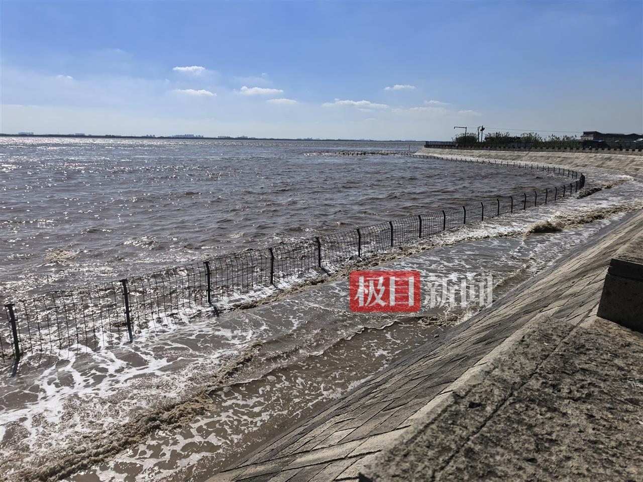 潮水在大缺口观潮点冲击堤岸