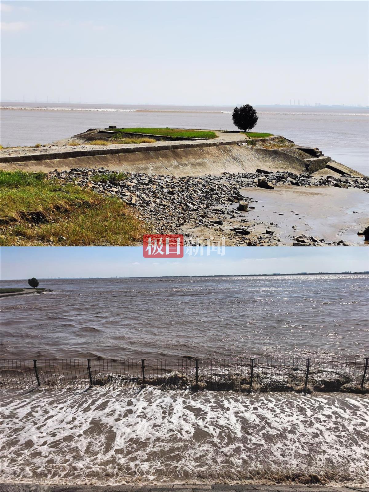 10月9日,海宁大缺口观潮点在潮水到来前后对比