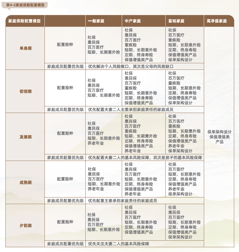 白皮书研究提出动态生命周期下不同财富水平的家庭,其风险特征与保障重点各不相同。比如:初创期一般家庭要优先预防“大病花钱、意外断收入”;发展期中产家庭得扛住“大病、意外+孩子教育、自己养老”双重压力;夕阳期家庭则要重点关注“大病住院、长期照护”的开支。鉴于研究结果,白皮书对不同生命周期、不同财富水平所面临的主要风险,以及需要解决的优先级进行了归类,并对解决这些风险的保险形态进行了梳理,总结出20类典型家庭风险配置模型。