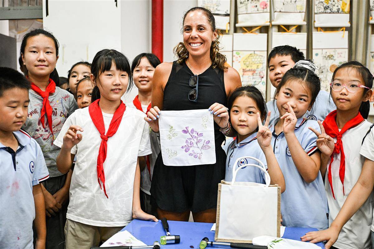 10月9日,武网参赛球员朱利亚娜·奥尔莫斯来到武汉市光谷第十七小学,与小学生们一起一起体验非遗植物拓染,感受中国传统文化的独特魅力。(湖北日报全媒记者 任勇 摄)