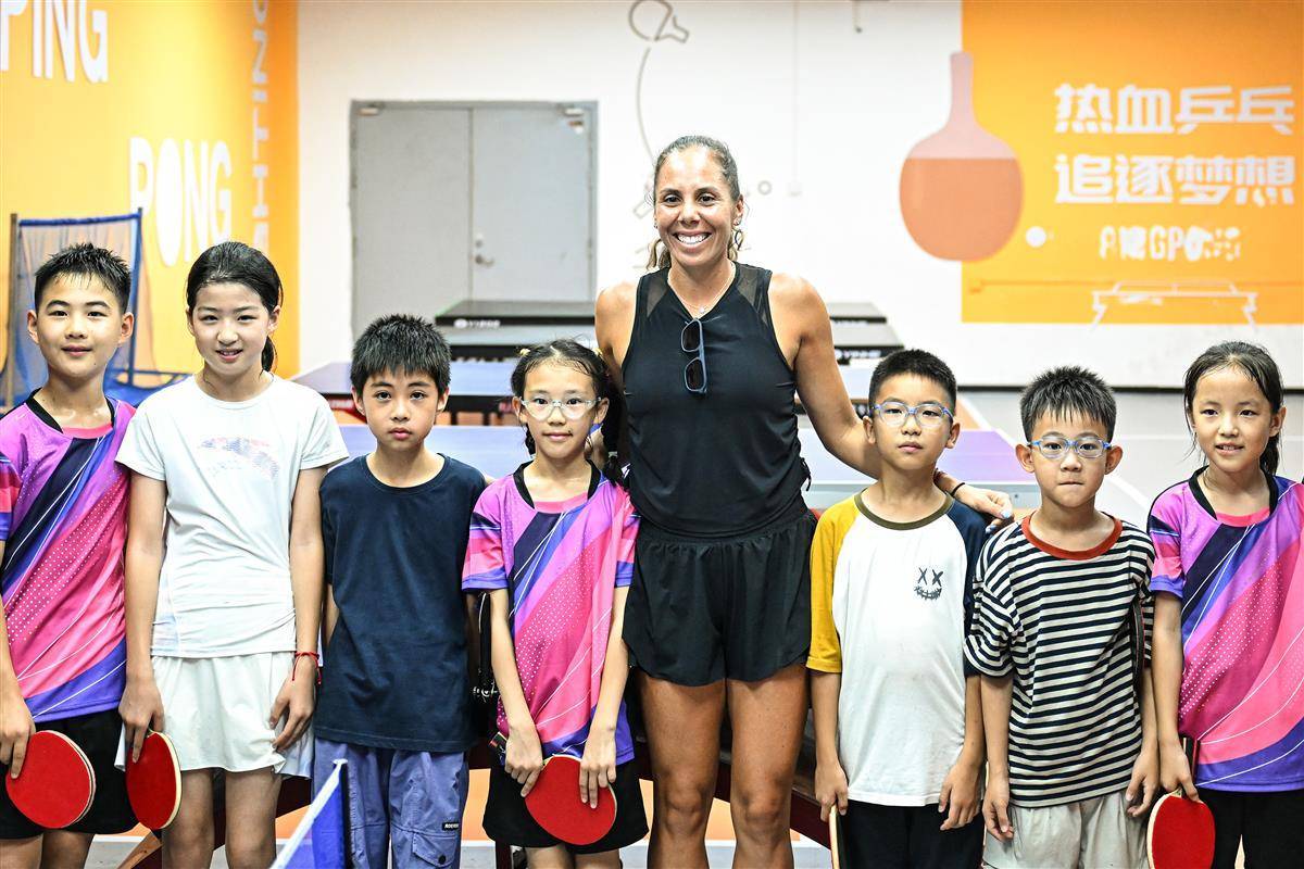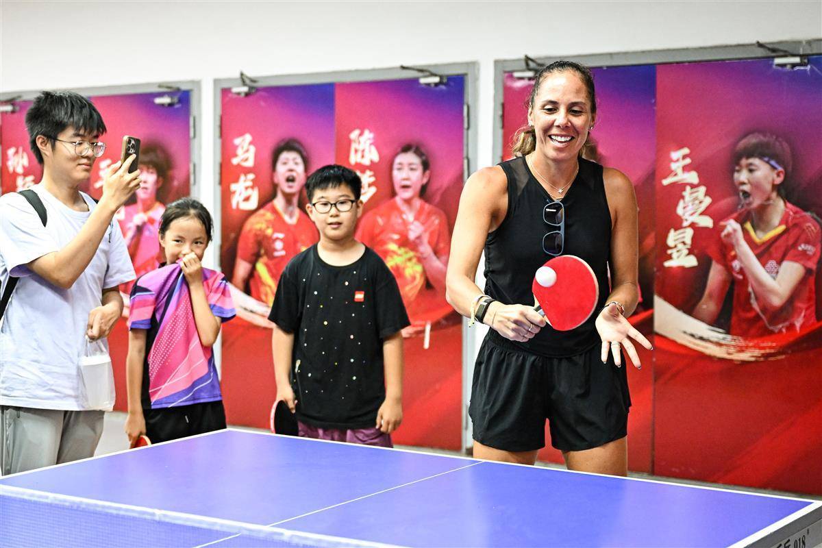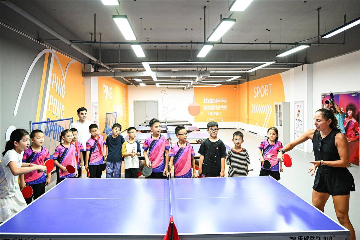 10月9日,武网参赛球员朱利亚娜·奥尔莫斯来到武汉市光谷第十七小学,与小学生们打乒乓球,切磋球艺。(湖北日报全媒记者 任勇 摄)