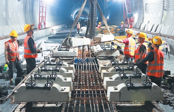 10月9日,在位于郧阳区柳陂镇境内的西十高铁友谊隧道内,建设者正忙着绑扎钢筋、吊装轨排、加固模板。该隧道建设主管工程师周雨介绍,为赶任务、保通车,今年国庆中秋假期项目部500余名建设者坚守在建设一线。目前,由武九客专湖北公司建设管理、中铁十一局承建的西十高铁友谊隧道无砟轨道施工进入冲刺阶段,无砟轨道施工总长12971米,已完成9092米,计划本月底完工,确保12月份开始钢轨铺设工作,为明年全线通车奠定基础。记者张启国摄