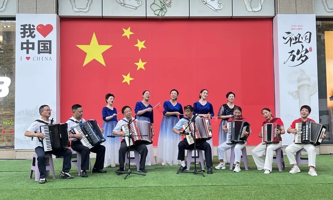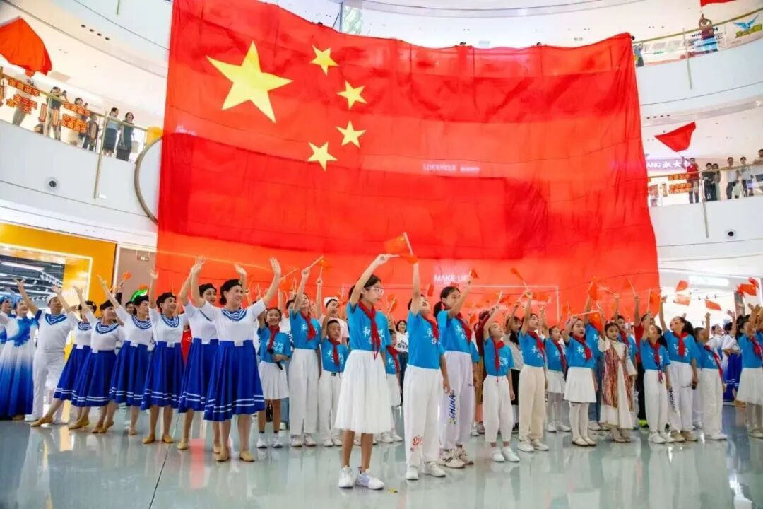 宜都市新时代文明实践中心精心策划国庆快闪文明实践活动,120余名志愿者倾情演绎,吸引了逾千名群众自发参与。众人同声高歌,挥舞国旗,现场洋溢着浓浓的爱国情。