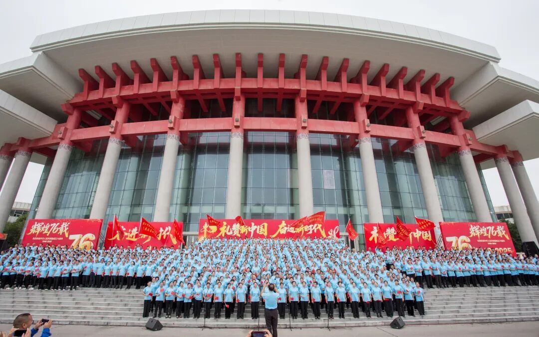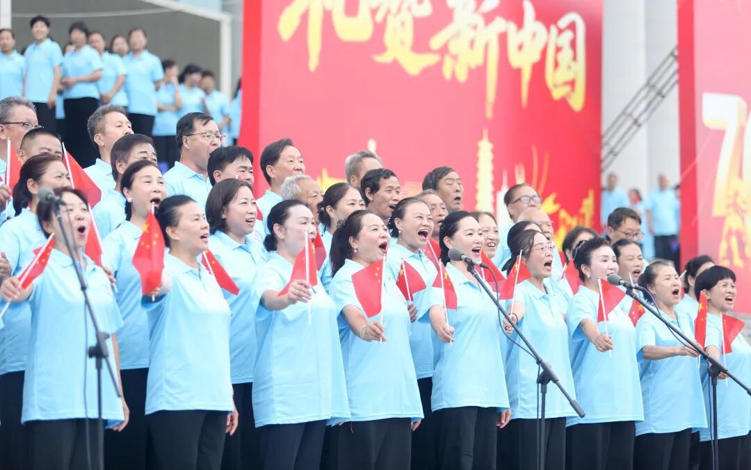 潜江市新时代文明实践中心在曹禺大剧院文明实践主题广场举办“礼赞新中国 奋进新时代”主题合唱展演活动,来自18支文旅志愿服务队伍的936名文明实践志愿者,以激昂旋律奏响新时代奋进强音,用嘹亮歌声传递对祖国的深情祝福。现场挥舞的国旗与歌声交织,汇成一片红色的海洋,爱国情怀在歌声中不断升华。