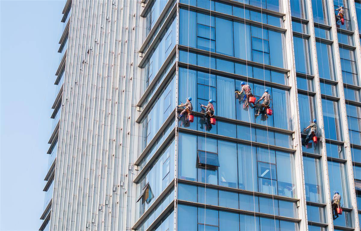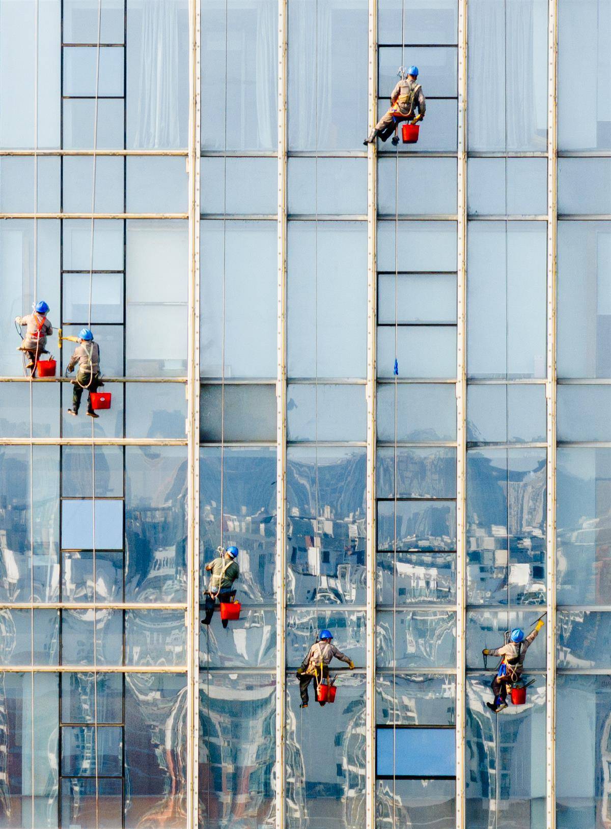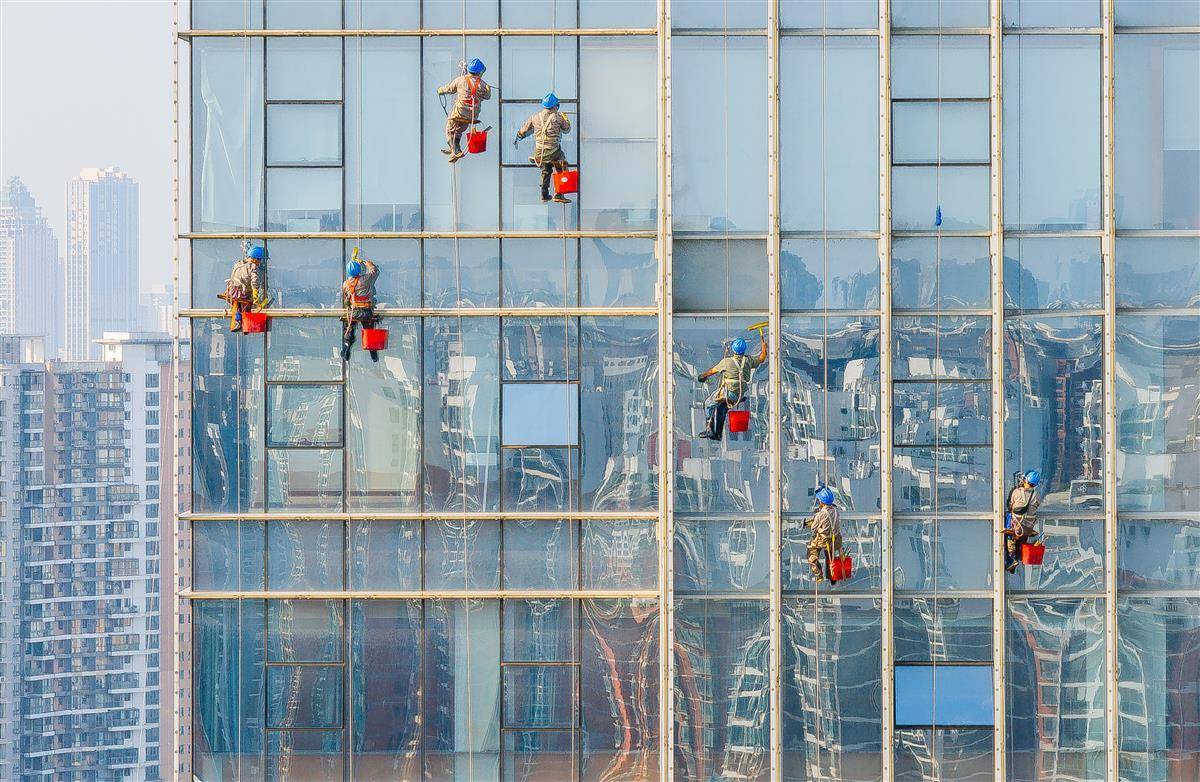 10月10日,武汉徐东大街,几名“蜘蛛人”在数十米高的大楼外墙清洗玻璃。他们的身后是飞翔的鸽子,脚下是滚滚车流。他们的身影和玻璃幕墙上城市的倒影融为一体,成为扮靓城市的一道最美风景线。(湖北日报全媒记者 柯皓 摄)