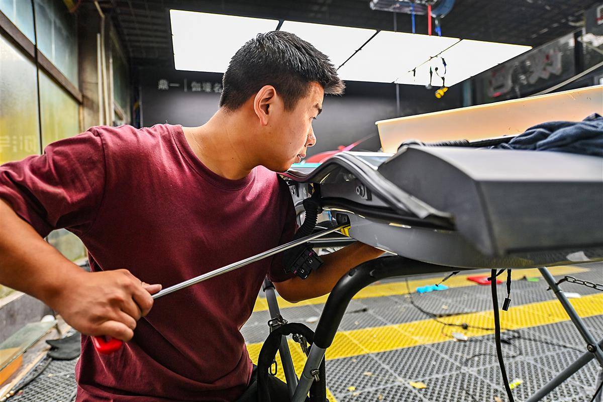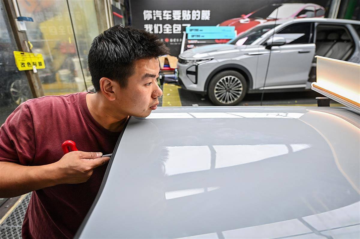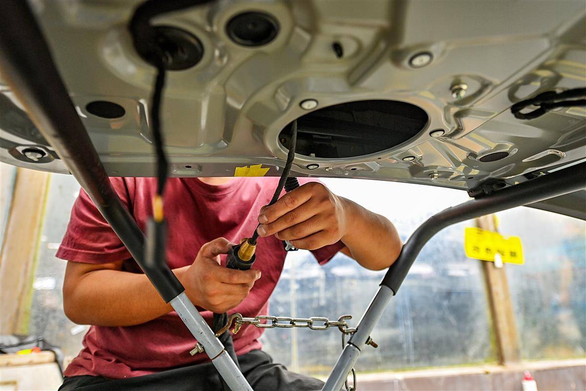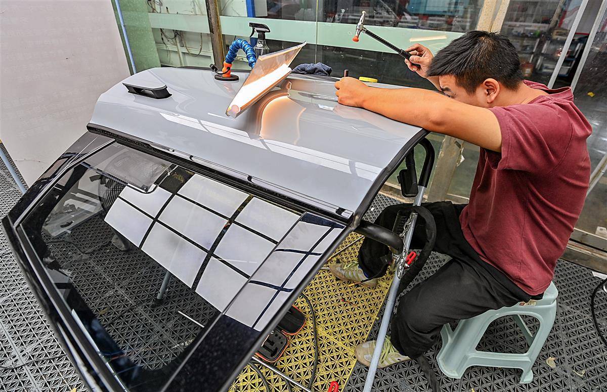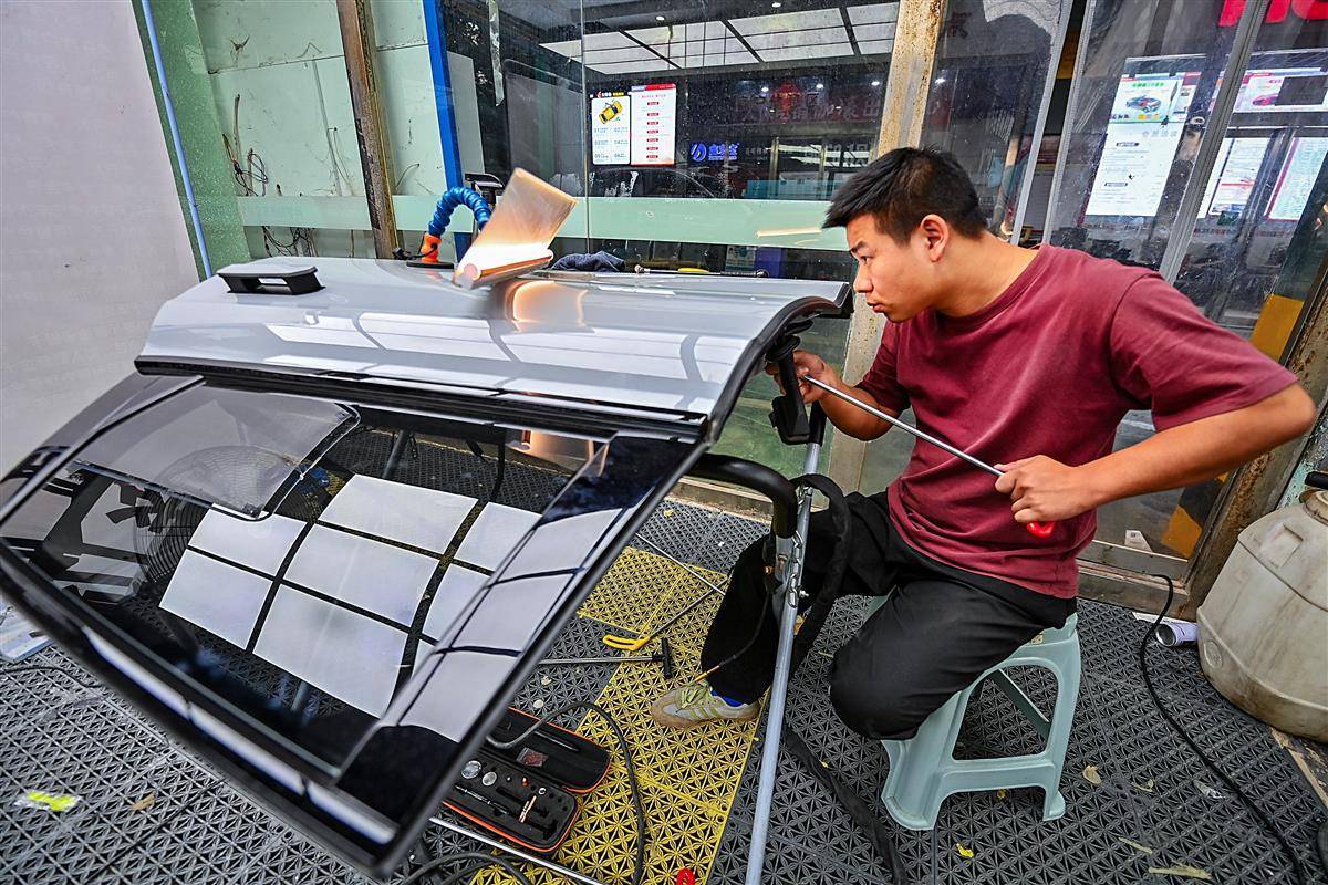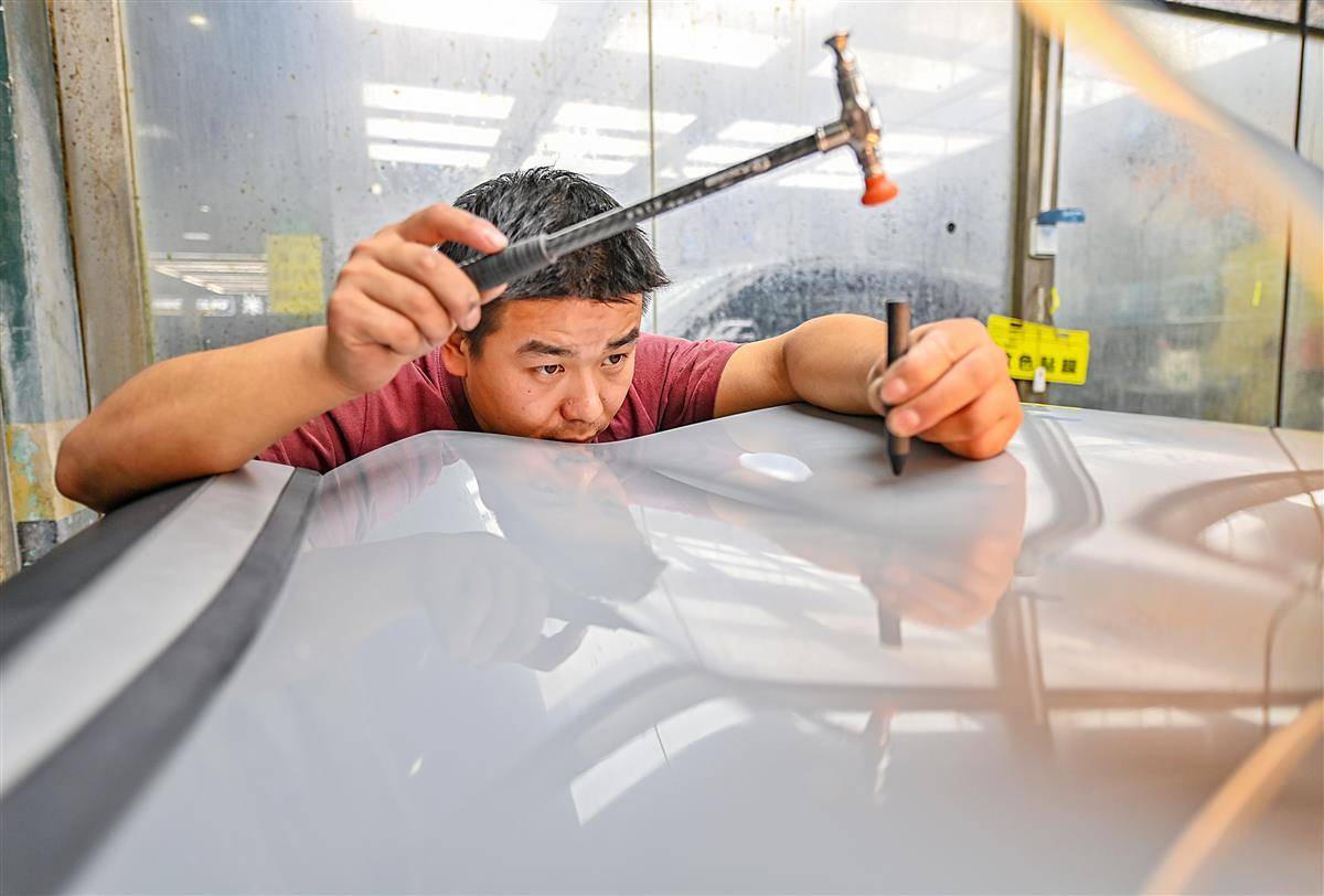 10月10日,武汉仁和路某汽车修理厂车间里,叶师傅正在进行汽车凹陷修复工作。汽车凹陷修复是一种基于光学、物理及力学原理的无损修复技术,通过杠杆原理在不破坏原车漆的前提下恢复车身凹陷,主要适用于未掉漆的锐角、钝角凹陷及冰雹坑。叶师傅称,相较于传统钣金修复需打磨车漆并经历多道喷涂工序,凹陷修复技术省略了喷漆环节。目前武汉已有60多家汽车修理厂开展汽车凹陷修复业务。(湖北日报全媒记者 朱熙勇 摄)