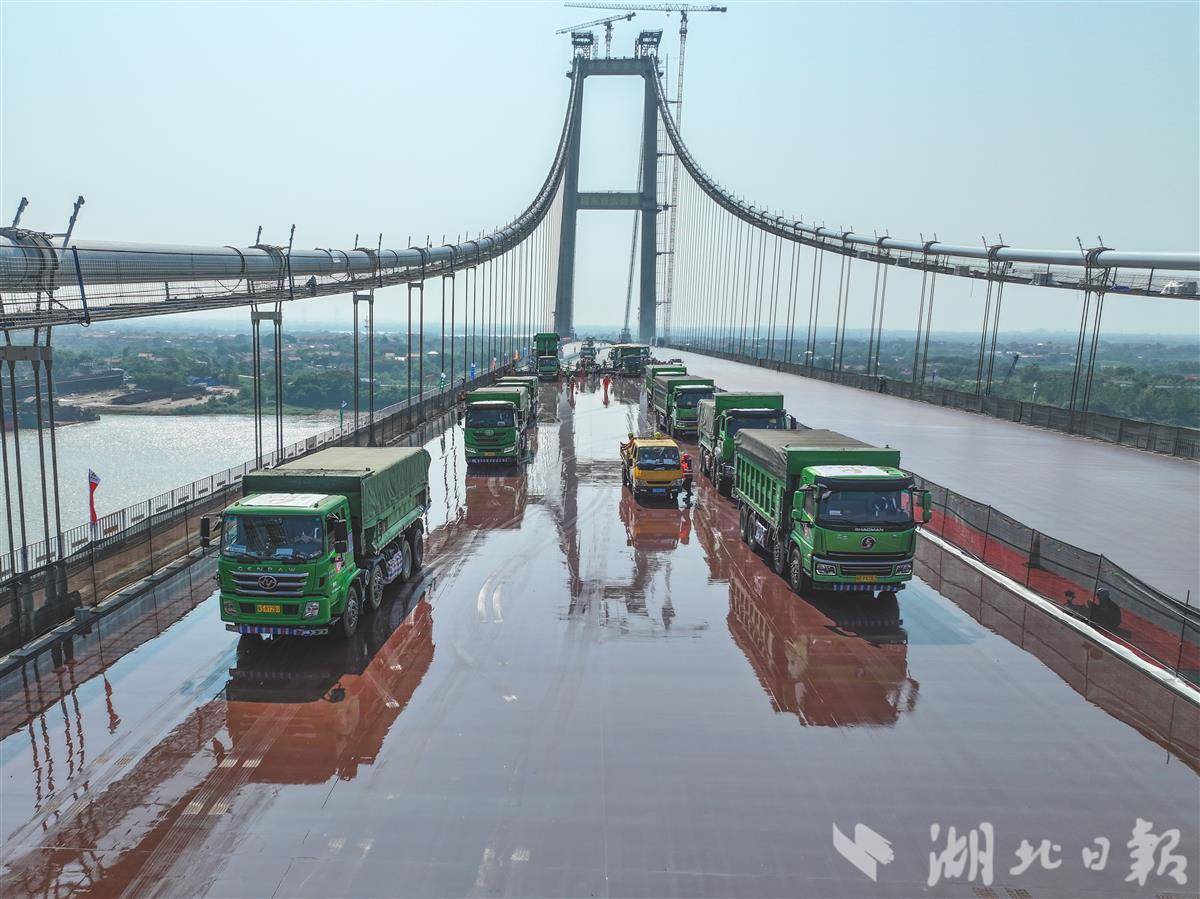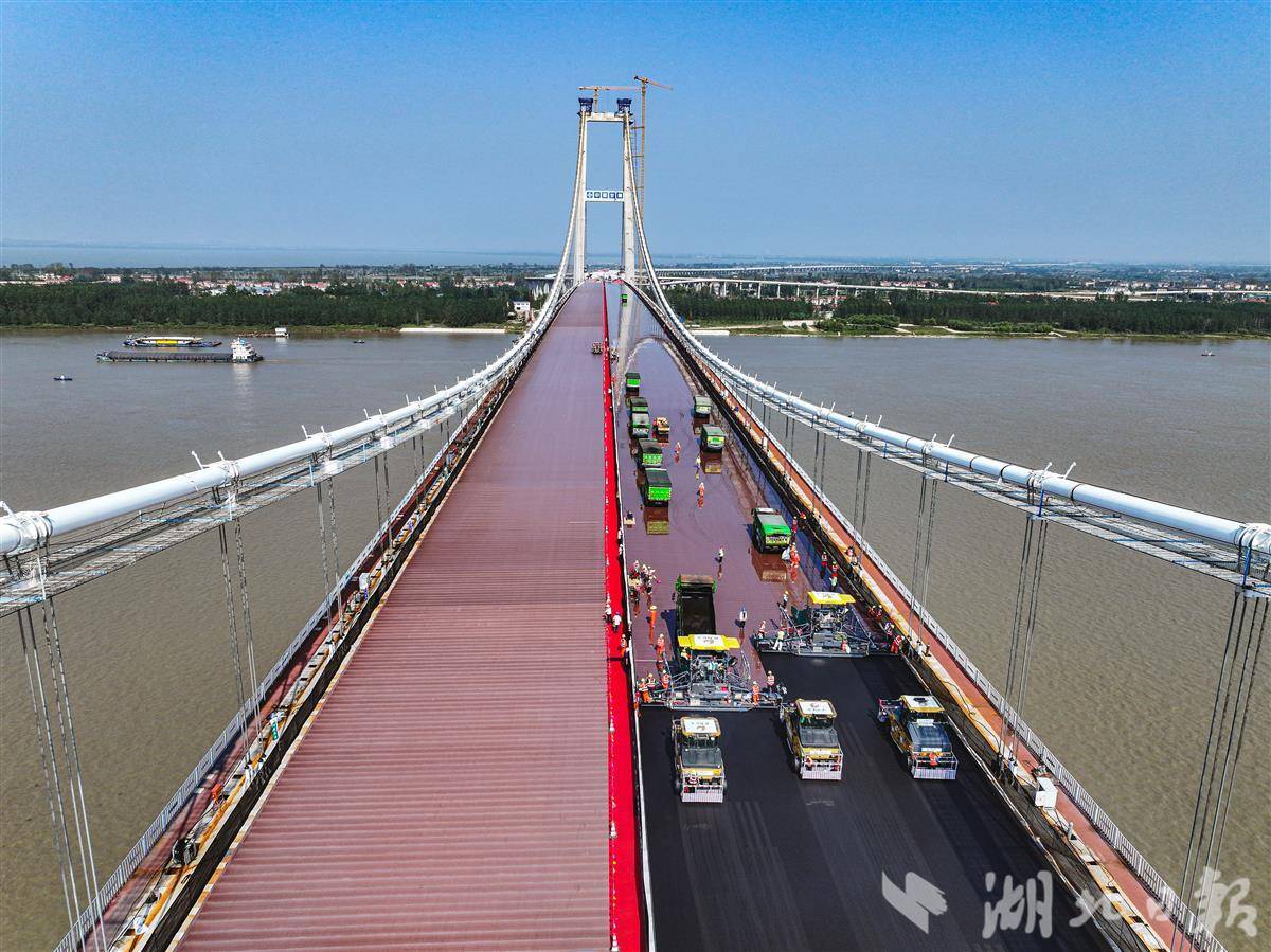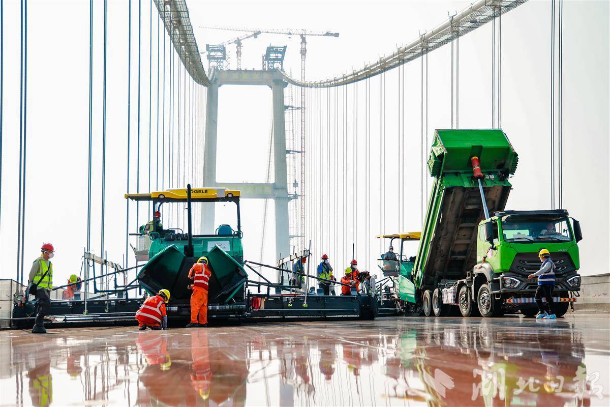 从武汉市新洲区驶上刚刚合龙的大桥桥面,喷洒上防水粘接层的桥面如同镜面,五六台摊铺机、压路机轮番碾压冒着热气的黑色混凝土,将沥青和钢箱梁深深“吻”在一起。“这是添加了环氧树脂的环氧沥青混凝土。”一旁的湖北交投双柳桥公司副总经理付永乐介绍,当天投入设备40台套,300余名建设者昼夜不息作业,确保施工进度和环氧沥青的铺装质量达标。