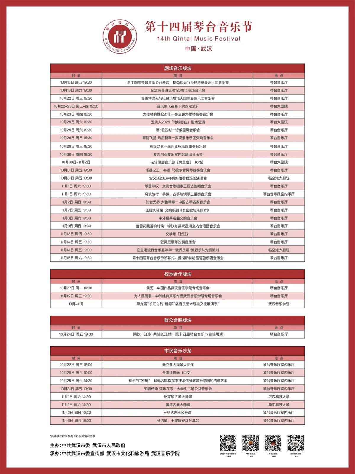 琴台音乐节始终践行文化惠民理念,持续推出惠民票价,并安排10场线上免费直播。同时,将在琴台音乐厅、华中科技大学等地举办市民音乐沙龙,邀请艺术家与市民面对面交流。中外艺术家还将走进黄鹤楼、古琴台、江汉关、汉阳门花园等城市文化地标。