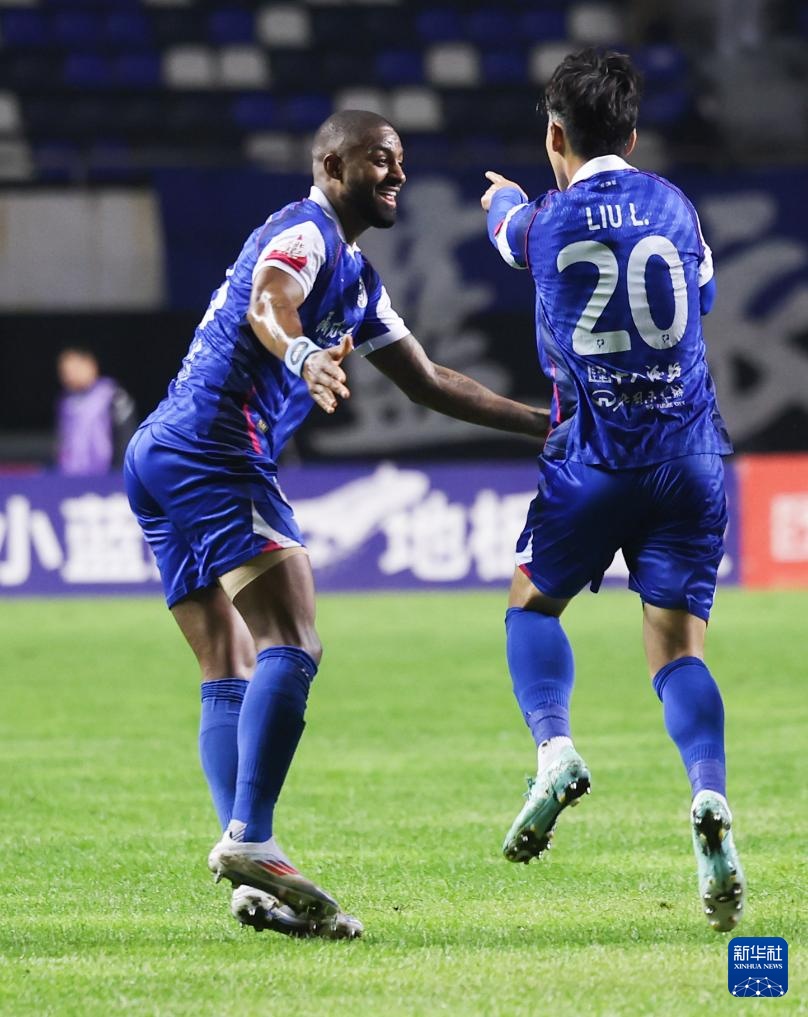 10月11日,石家庄功夫队球员刘乐(右)庆祝进球。