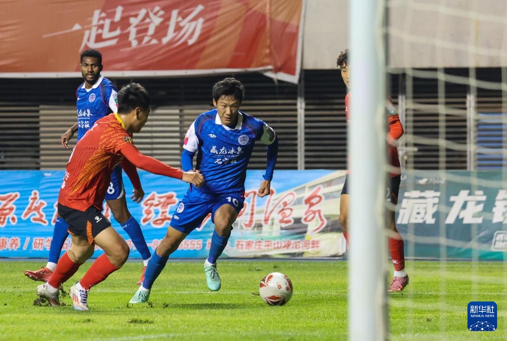 10月11日,石家庄功夫队球员安屹斐(左三)在比赛中进攻。