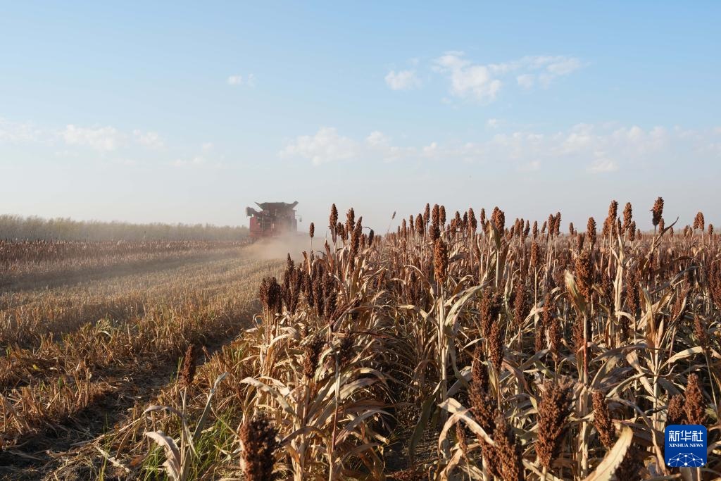 10月11日,在位于黑龙江省肇东市的北大荒集团四方山农场有限公司,机械设备在进行高粱收获作业。