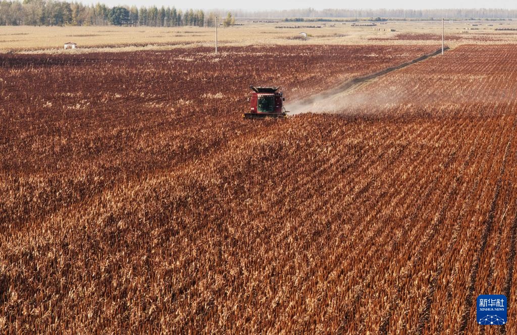 10月11日,在位于黑龙江省肇东市的北大荒集团四方山农场有限公司,机械设备在进行高粱收获作业(无人机照片)。