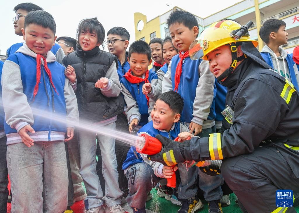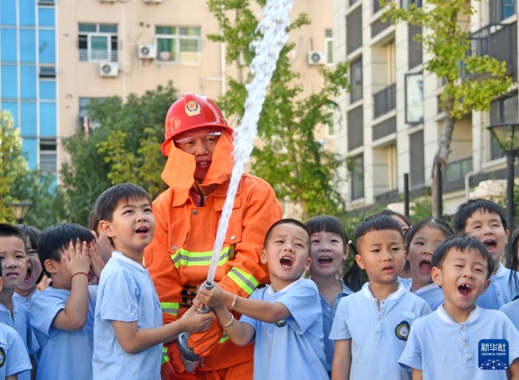10月13日,河南省商丘市夏邑县会亭镇阳光小学学生在消防员引导下体验水枪。