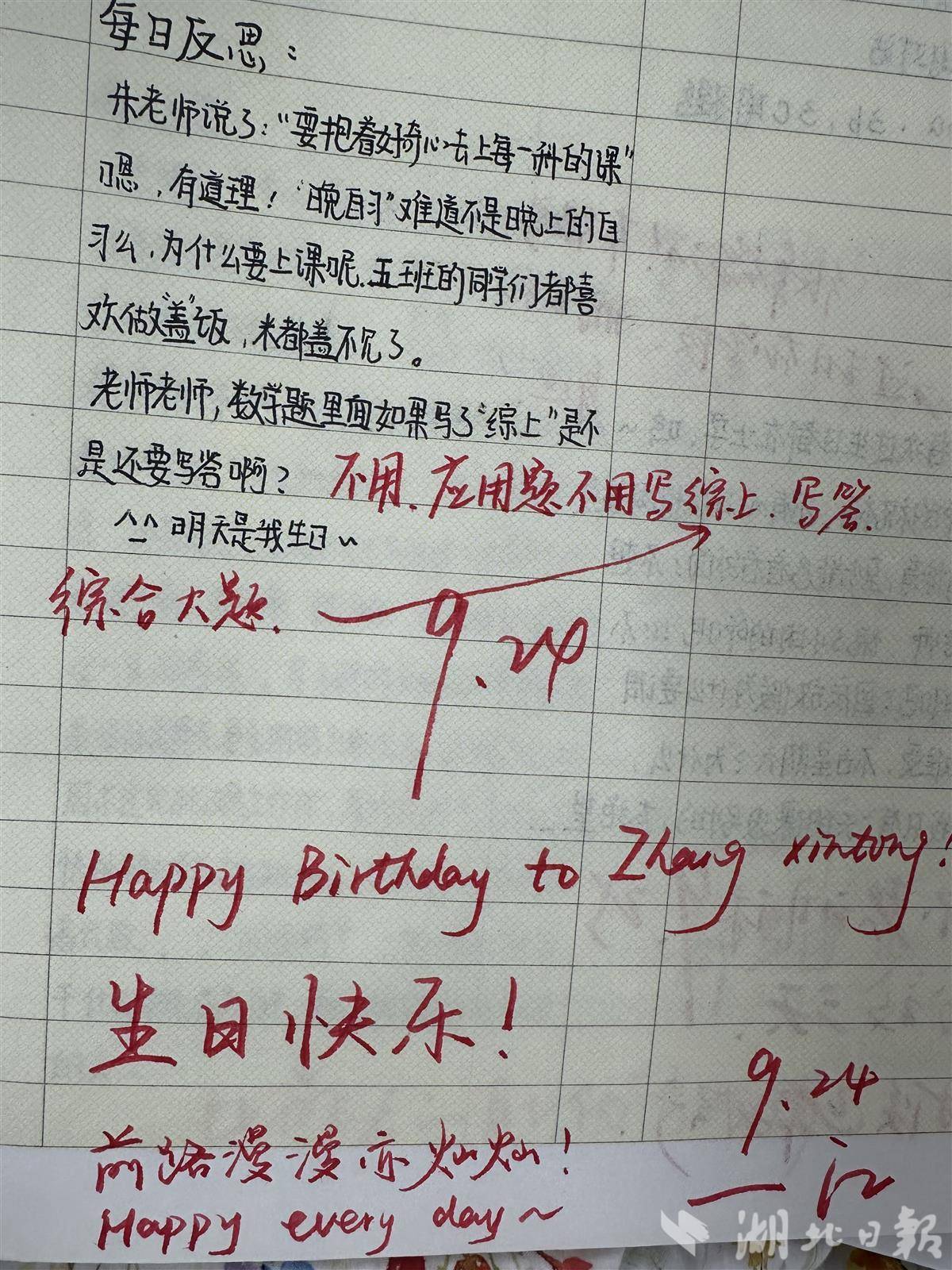 翻开这本联系本,温暖的对话记录着学生成长的点点滴滴:有学生因“做操动作不标准”而烦恼,江旭批注“多看标准视频,勤加练习,你一定可以”;学生张欣潼悄悄写下生日愿望,次日便收到老师“前途漫漫亦灿灿”的祝福;家长反馈“孩子效率提升”,老师回应“每一天的坚持都在积累改变”。