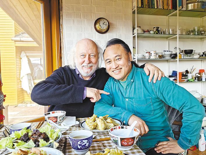 2024年,余泽民到拉斯洛家中给他做中餐,两人开心地合影。(受访者供图)