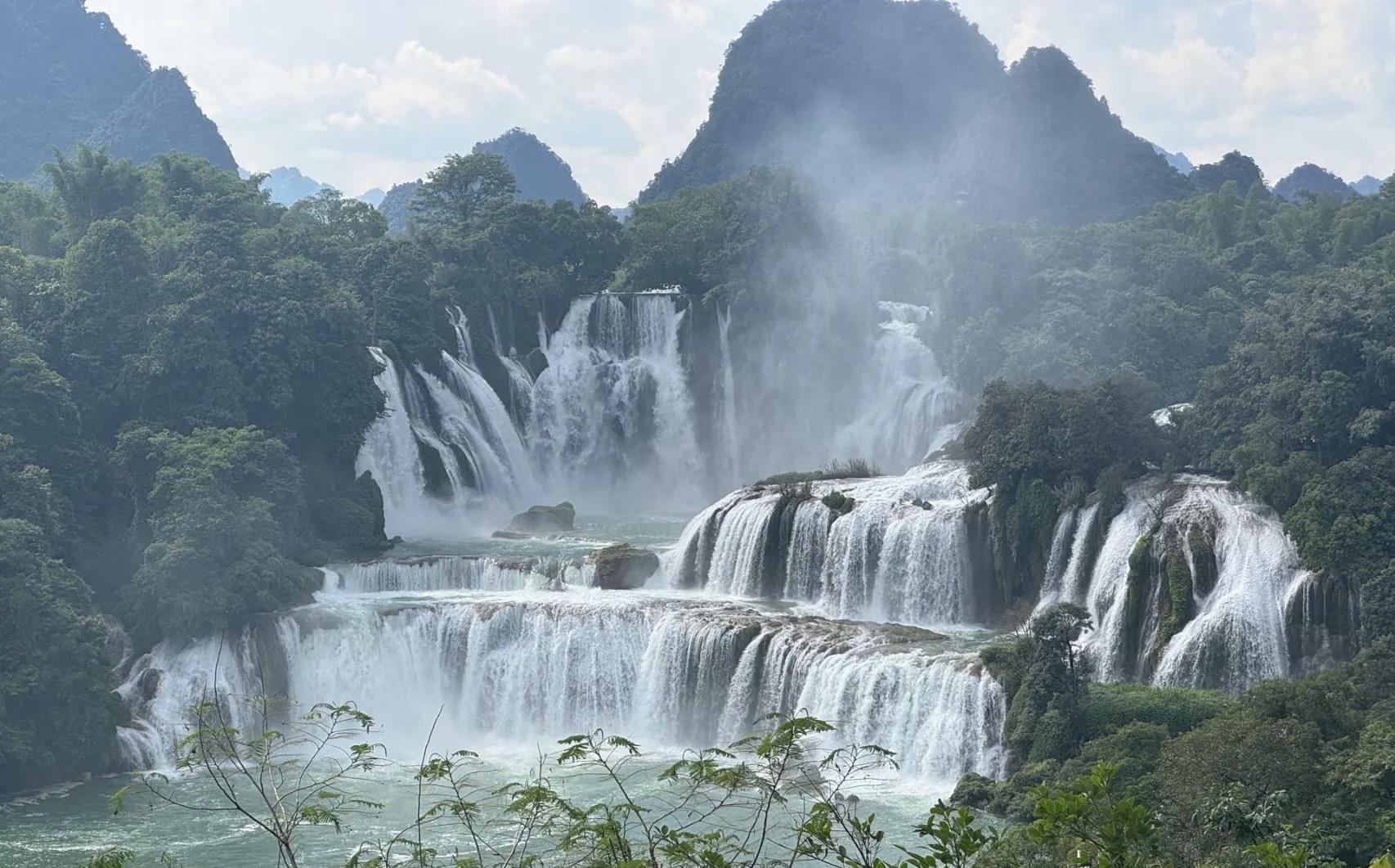 德天跨国瀑布景区位于广西崇左市。据景区公开资料,德天大瀑布横跨越中两国,瀑布宽约120米,纵深约70米,呈三级跌落形成独特的景观层次,是亚洲第一、世界第四大的跨国瀑布,年均水流量约为贵州黄果树瀑布的三倍。德天大瀑布的水以清澈著称,其水质常年保持碧绿色调,远望瀑布就像一条白色绢丝挂在两国边界。