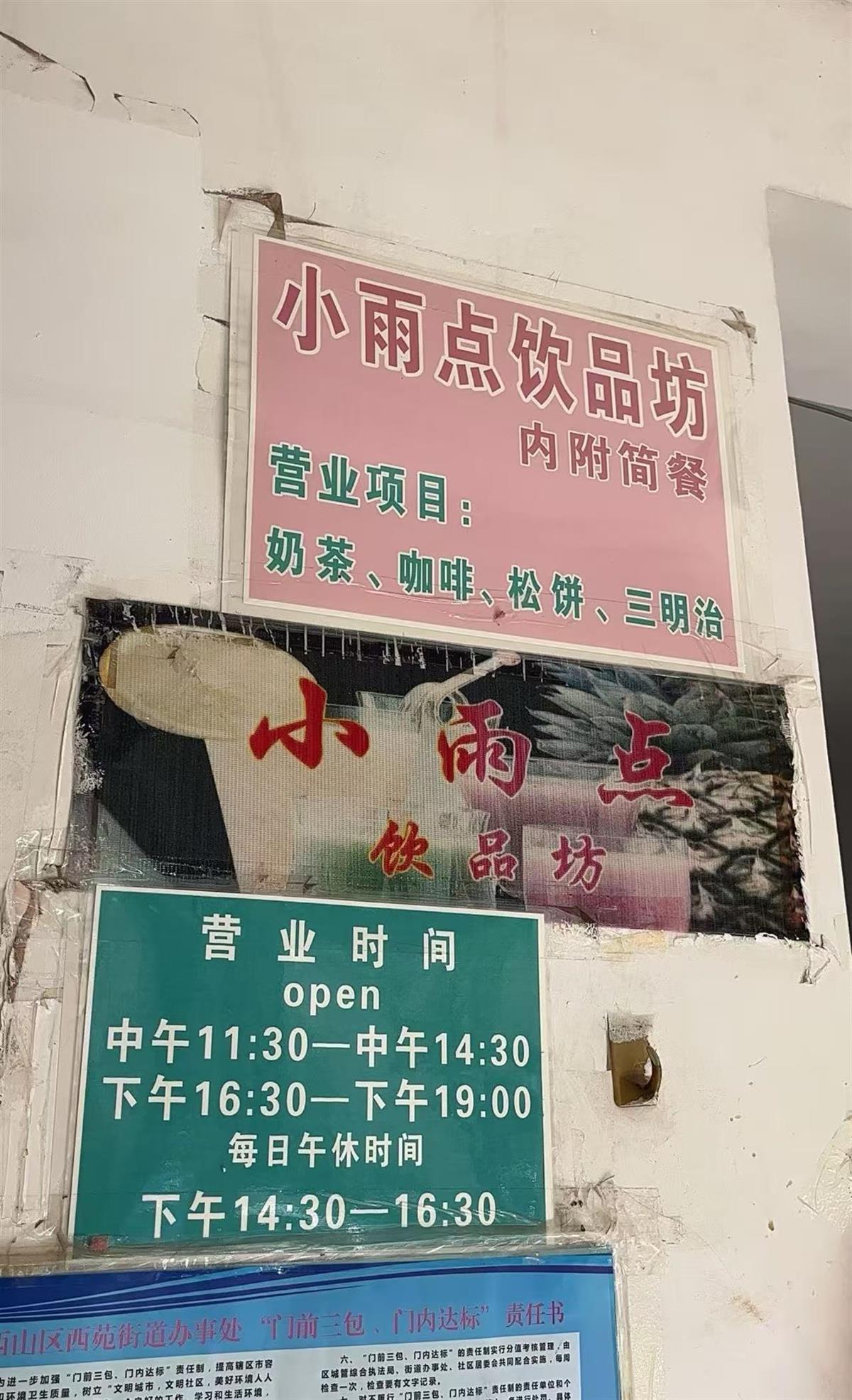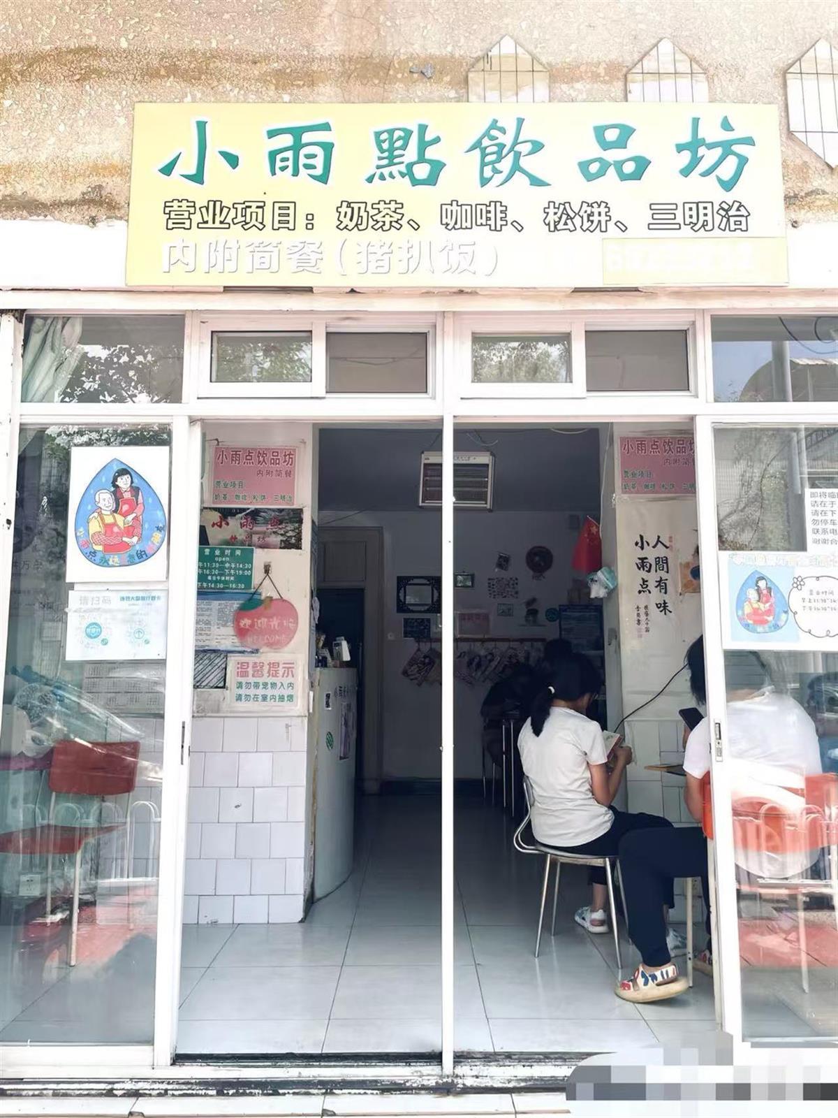 “小雨点永远是您的好朋友”——这句话被贴在“小雨点饮品坊”(下称小雨点)入口左边的收银台上。收银台面上,画着一对老人卡通头像的菜单上写着:猪扒饭小份10元,大份15元。店内还售卖奶茶、三明治等等。