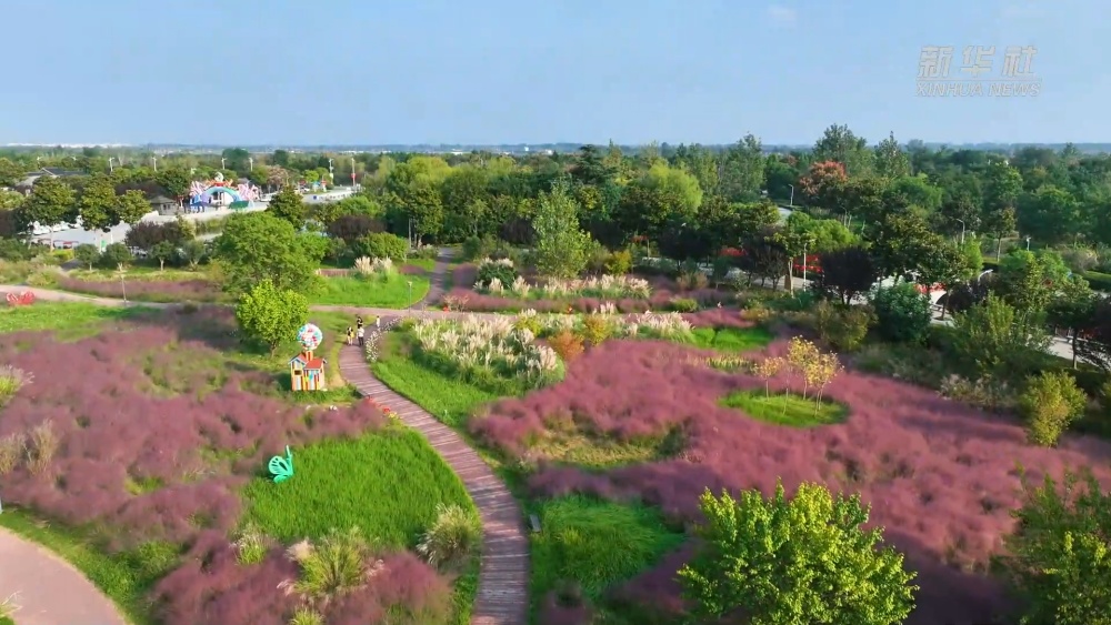 金秋时节,天朗气清,江苏省盐城市建湖县九龙口国家湿地公园的粉黛乱子草进入盛花期,成为当地秋日限定美景。