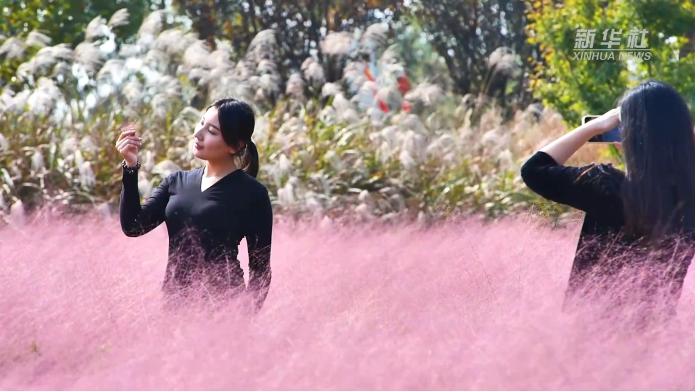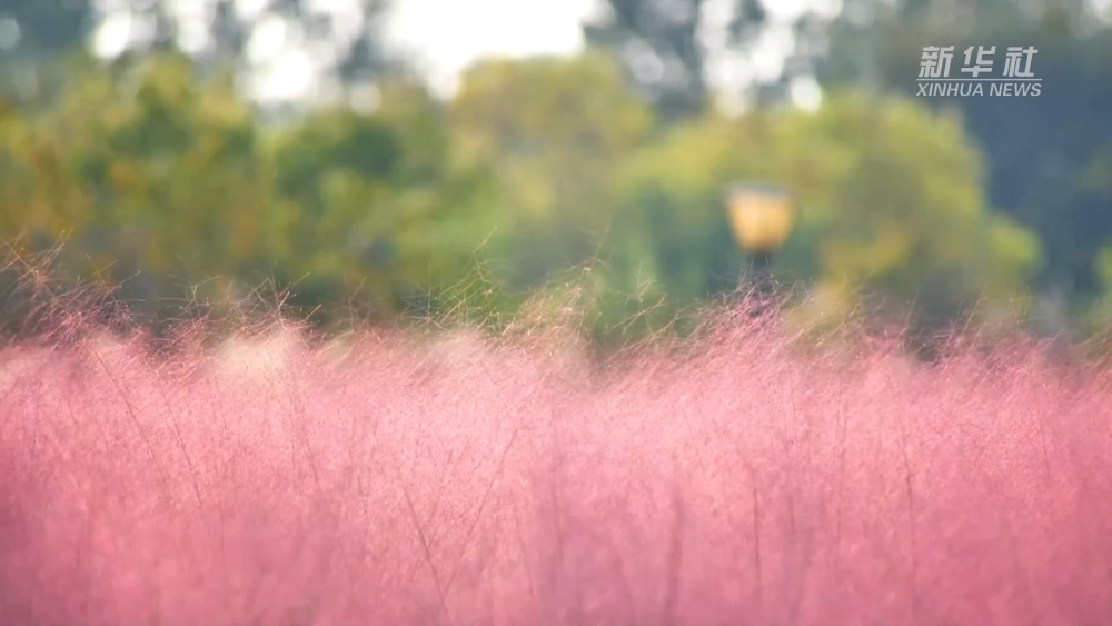 园内粉黛似揉碎的粉霞裹着轻雾,层层铺展成连片绯色地毯。微风拂过,纤细花穗轻颤间泛起细碎浪纹。游客漫步花海,感受秋日浪漫气息。