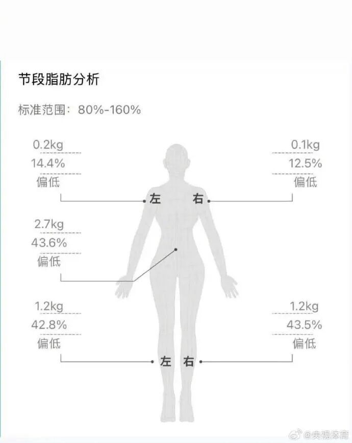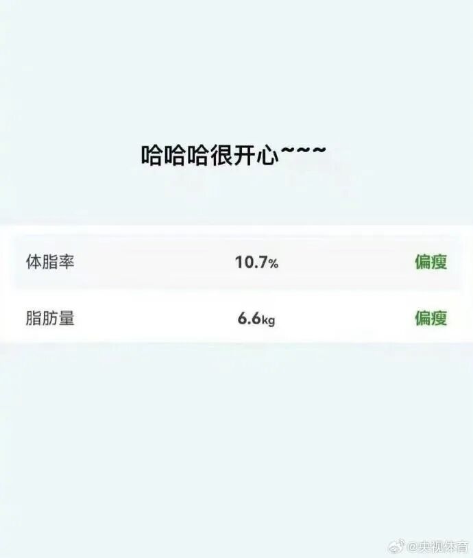 据@央视体育 10月14日消息,吴艳妮社媒晒图:体脂率10.7%,脂肪量6.6kg,并配文“哈哈哈很开心~~~”。图片右侧的分析结果显示其“偏瘦”。
