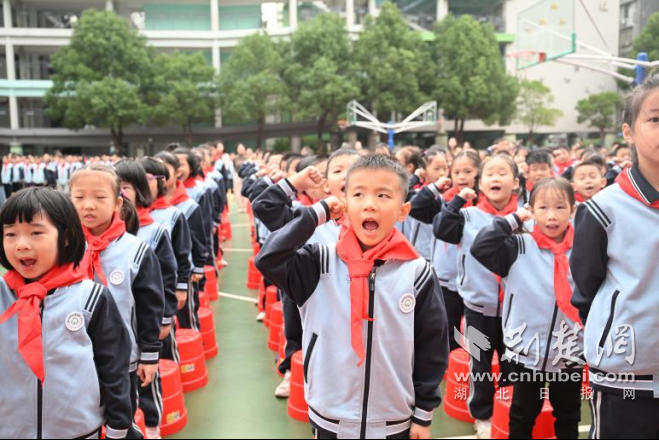 学校党总支书记马新银殷切嘱托队员们以榜样为镜,在红领巾指引下茁壮成长。全体队员在大队辅导员带领下庄严呼号。