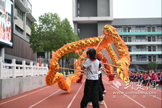 校合唱团、舞蹈队合演节目《如愿》,用歌声和舞蹈致敬榜样、展望未来。中华传统文化舞龙表演《龙的传人》,在铿锵鼓点中展现了少年自强风采。