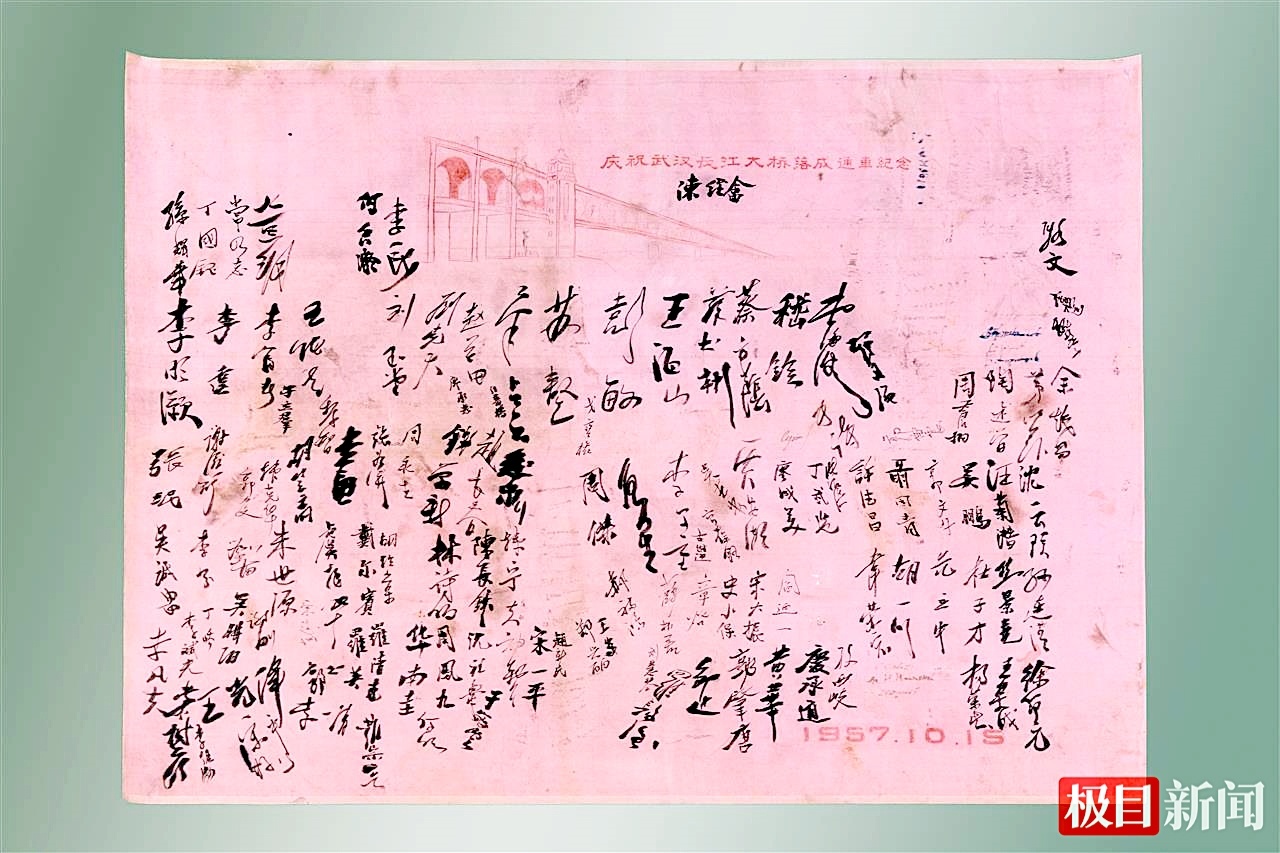 楚天都市报极目新闻讯(通讯员邢影)一方粉色的丝绸,密密麻麻上百个签名,共同见证了新中国桥梁建设的重要历史时刻。10月15日,正值武汉长江大桥通车68周年纪念日,桥梁博物馆正式公开展陈“1957年10月15日武汉长江大桥通车仪式参加者签名”,为观众打开一扇回望历史的窗口。