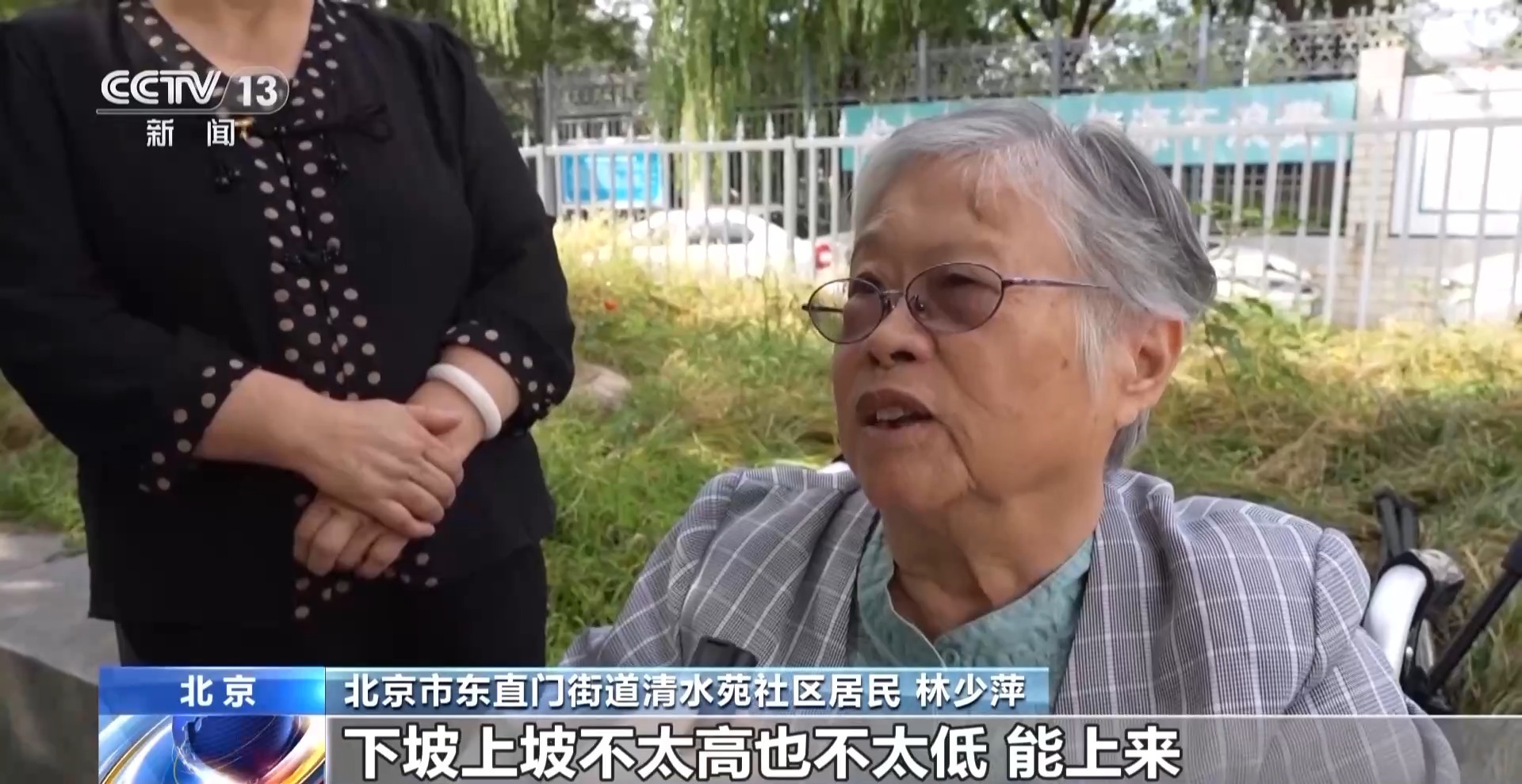北京市东直门街道清水苑社区居民 林少萍:坐轮椅的到这儿还是挺方便的,下坡不太高也不太低,能上来。