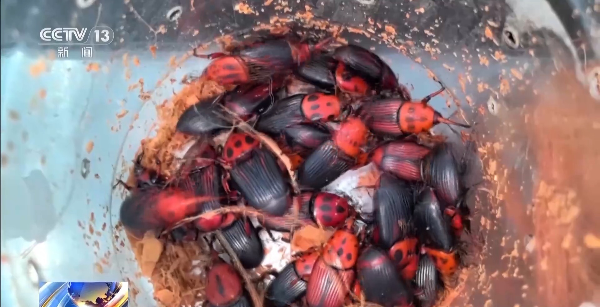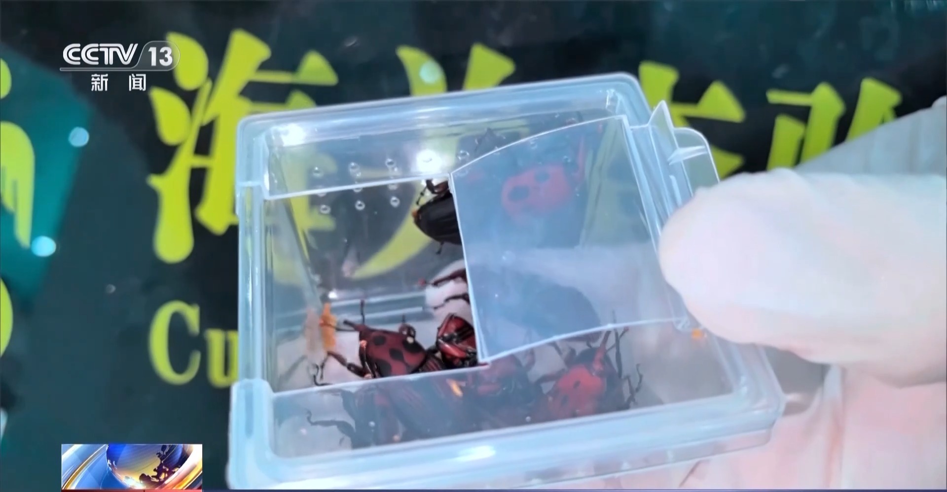南宁海关所属东兴海关旅检一科副科长 魏谦详:我们在背包里面查获一个透明的塑料罐,罐身上扎了很多气孔,罐子里面填充有很多果皮类饲养材料,可看见有不少昆虫在罐底活动,共有36头。