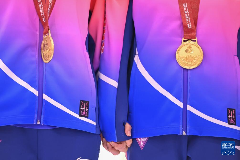 10月17日,在射击女子10米气手枪团体决赛铜牌赛后,广西队选手拥抱庆祝胜利。